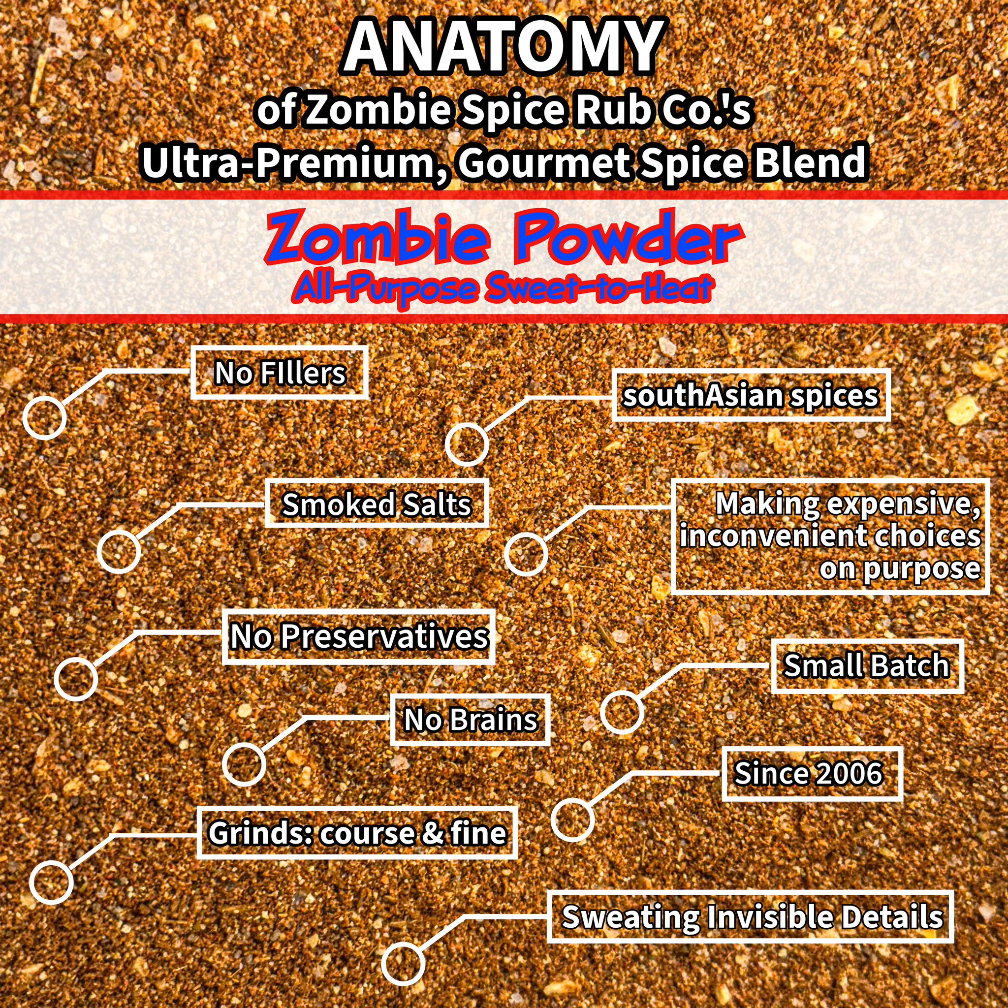 From dry rubbing ribs, steak, hamburgers, lamb, wild game to salmon, tofu and vegetables, even sprinkling over your favorite egg style; fried, omelets, deviled, you name it. Zombie Powder is great for grilling, smoking, baking or roasting. In soups, stews, as a different way to season a pot of chili, over potatoes and sweet potatoes, or blended into dressings, condiments, and dips.